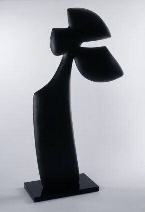 Alliant la sensualité à la sobriété, cette sculpture d’Étienne Hajdu constitue la synthèse parfaite de son œuvre à partir des années 1950. Réalisée en ardoise et en marbre noir, elle représente la figure biblique de la reine de Saba, aussi connue sous le nom de Balkis ou Bilqis, qui régnait sur le royaume de Saba, en Érythrée. En épurant les formes au maximum, Étienne Hajdu a su capturer le profil élancé d’une reine décrite comme une femme de pouvoir d’une grande beauté. La figure est montrée de profil, sa chevelure imposante se détache de sa tête et son buste semble ne faire plus qu’un avec le reste de son corps. La féminité du sujet traité comme un relief à double face est suggérée par le jeu entre les courbes et les lignes plus tranchantes ainsi que par l’aspect poli, presque étincelant, des matières utilisées.