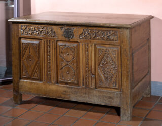 Aisément déplaçable, le coffre est l’une des pièces de mobilier les plus anciennes. Très répandu dans les fermes, il servait à conserver le bois ou l’avoine, à ranger les vêtements et pouvait même, une fois fermé, faire office de banc. Il reste le mobilier principal jusqu’à la fin du 18e, pour être remplacé progressivement par d’autres meubles de rangement, comme l’armoire par exemple. Celle-ci trouve une forme particulière en Bresse.