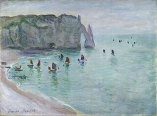 Dans cette toile, l’horizon brumeux mêle ciel et mer avec poésie tandis que la falaise, immuable, veille sur le départ en mer. Par sa touche fragmentée et d’infimes coups de pinceau, Monet a su transcrire les scintillements de l’eau et les mouvements marins, traversés par les effets de vent et de lumière d’une Normandie qu’il chérit.