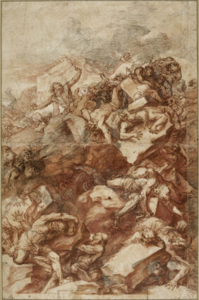 Ce dessin a pu être rapproché d’une grande gravure à l’eau-forte de Salvator Rosa réalisée en 1663. Il existe plusieurs études préparatoires à cette scène. Le sujet est explicité par la légende imprimée dans le cartouche en bas de l’estampe : des vers empruntés au In Rufinum du poète latin Claudius Claudianus (vers 370 – vers 404 ?). La scène se réfère à l’épisode mythologique où les Géants tentèrent de détrôner Zeus du royaume des cieux et entassèrent « montagnes sur montagnes pour s’élever jusqu’aux astres ». Zeus a alors foudroyé les rochers qui écrasent les assaillants.