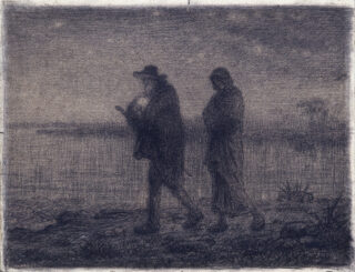 Dans la nuit, sous un ciel étoilé, un couple avance dans un paysage peu défini. Il s’agit d’un des rares sujets religieux traité par Jean-François Millet, La fuite en Égypte, mais le peintre s’autorise une version contemporaine. Ici, seul le nimbe éclairant la tête de l’Enfant évoque la sainte Famille, Joseph et Marie sont des paysans de Barbizon.