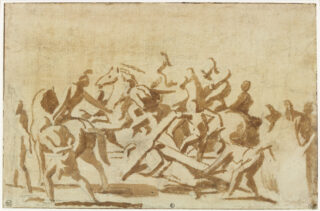 Dans cette étude, Nicolas Poussin a utilisé une technique qu’il a très peu employée : le lavis brun, posé au pinceau sur une légère esquisse à la pierre noire. Seuls trois autres dessins ont été réalisés de la même manière, à la fin des années 1640.