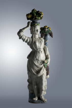 Si l’on en croit une inscription portée sur le socle d’une œuvre similaire, attribuée à Giovanni della Robbia, ces élégantes canéphores étaient offertes pour accompagner des vœux de prospérité à une maison amie.