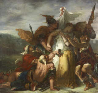 La jeune femme, dans un mouvement de repli, cache son sein de son bras gauche tandis que du droit elle repousse le soldat qui lui arrache son voile. Le détail des bijoux et des drapés, la coupe de vin symbolisant l’ivresse suffisent à placer la scène dans un Orient plus fantasmé que réel.