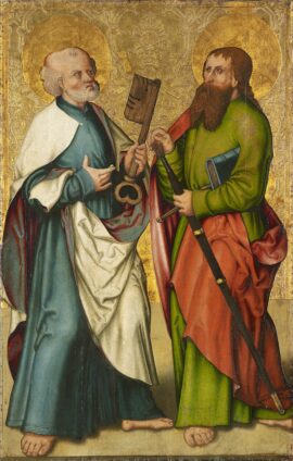 Les apôtres Pierre et Paul se font face devant un fond doré à motifs de brocarts. Ils semblent plongés dans une conversation : la bouche de Pierre est entrouverte et sa main droite est levée vers Paul dans un geste oratoire. De sa main gauche, Pierre tient une grande clé tandis que Paul porte un livre et une épée. Ils sont tous deux de forte stature, un effet renforcé par leurs grands pieds, leurs mains robustes et leurs crânes enflés. Les robes aux plis droits leur confèrent également un caractère monumental. La physionomie des visages et leur modelé, tout comme les coloris chatoyants, rappellent les peintres de l’entourage de Dürer, tels Hans Schäufelin et Hans Süß von Kulmbach.