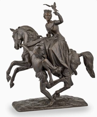 Fille de Charles le Téméraire et d’Isabelle de Bourbon, Marie de Bourgogne est l’héritière du duché à la mort de son père en 1477. Elle se marie avec le futur Empereur du Saint-Empire Romain Germanique Maximilien Ier de Habsbourg afin de sauver les restes du duché attaqué et occupé par le royaume de France. Elle meurt en 1482 des suites d’une chute de cheval, lors d’une chasse au faucon. C’est cet épisode de l’histoire de France et de Bourgogne, anecdotique au regard des enjeux européens d’alors, qui est évoqué ici. En effet, ce groupe montre la duchesse, dans une toilette raffinée, montée sur un cheval cabré, retenu par un page, le bras élégamment levé en l’air pour accueillir l’oiseau de proie.