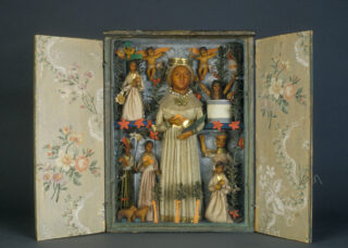 Cet oratoire domestique présente au sein d’une boîte, sous forme de figurines de cire, des scènes de la vie de sainte Reine, martyre chrétienne du 3e siècle. Elle était priée pour favoriser les naissances ou soigner certaines maladies, soit lors d’un pèlerinage à Alise-Sainte-Reine en Côte-d’Or (21), soit grâce à ces boîtes de dévotion. Elles étaient alors transportées de village en village, sur le dos d’un colporteur surnommé le « montrou ».