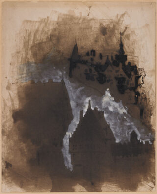 Dans cette rêverie gothique autour d’une cité médiévale inventée, on retrouve la technique toute personnelle de Victor Hugo, au service de l’émotion : encre de Chine étendue au pinceau, frottée, rehaussée de gouache blanche pour mieux découper les silhouettes reprises à la plume.