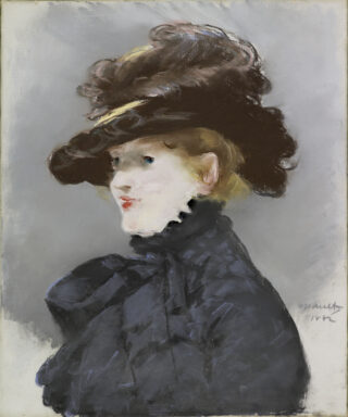 Née à Nancy, Méry Laurent, de son vrai nom Anne-Rose Louviot, a seize ans quand elle s’installe à Paris. Après de brèves apparitions théâtrales, elle fréquente les salons mondains et devient l’égérie de plusieurs artistes à la fin du 19e siècle, dont le poète Stéphane Mallarmé et le peintre Édouard Manet, qu’elle rencontre dans son atelier en 1876. Séduit par sa beauté, ce dernier la représente d’abord sous les traits de L’Automne (musée des Beaux-Arts de Nancy). Au cours de l’année 1882, il réalise sept portraits de la jeune femme en buste, aux tenues et coiffures variées qui montrent l’intérêt de Manet pour la mode féminine. Parmi eux, le pastel de Dijon est conforme aux descriptions de son modèle : teint très blanc, chevelure dorée, sourcils étirés. Nulle intention psychologique en revanche, sacrifiée à l’exaltation de l’élégance.