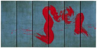 Dans les années 2010, Fabienne Verdier a été invitée à travailler au cœur des collections du musée Groeninge à Bruges, qui conserve des chefs-d’œuvre de la Renaissance flamande. Elle a sélectionné six peintures dont elle a fait une analyse détaillée et à partir desquelles elle a peint plusieurs œuvres. Le polyptyque Saint Christophe traversant les eaux 3 est ainsi lié au Triptyque Moreel peint par Hans Memling entre 1484 et 1487. Verdier a été fascinée par les méandres et la profondeur de l’eau ainsi que par les drapés rouges des tuniques du Christ et du saint. Elle aisolé ce motif et retranscrit leur volume ainsi que la vivacité des contrastes de couleur. Le trait à l’encre rouge se déploie en profondeur et ondule sur les panneaux, il évoque à la fois la présence des personnages dans l’espace et le gonflé des tuniques. Les méandres que l’on observe dans ces formes sont une manière de transposer les mouvements de l’eau.