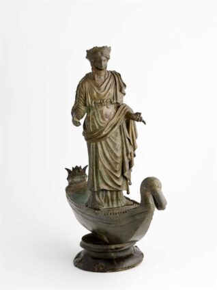 Cette statuette en bronze est composée de trois parties. Elle représente une figure féminine, coiffée d’un diadème, vêtue d’un chiton agrafé par des fibules rondes et retenue par une ceinture, qui couvre les pieds. Par-dessus elle porte un ample manteau. Elle est debout sur une barque, qui porte en figure de proue une tête de canard serrant dans son bec un fruit rond. L’ensemble repose sur un socle circulaire.