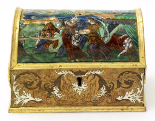 Caractéristique de la production des ateliers limousins à la Renaissance, ce coffret est attribué à l’un des grands maîtres émailleurs de la seconde moitié du 16e siècle, Pierre Courteys, l’un des représentants les plus habiles et les plus originaux de la Renaissance française.