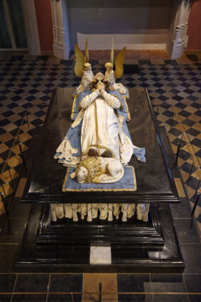 Son heaume est porté par deux anges et ses pieds reposent sur un lion. Autour du coffre, une architecture de marbre blanc finement sculptée et en partie dorée contraste avec le marbre noir de la base et de la dalle. Sous ces arcades défile un cortège de pleurants d’albâtre : aspergeant, enfants de chœur, acolyte, diacre, évêque, chantres, chartreux, suivis de l’entourage du duc, drapé dans des manteaux de deuil.