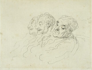 Ce dessin qui représente trois hommes assistant à un spectacle appartient à ces évocations du milieu théâtral. Daumier se place dans le public ou sur la scène, dans les coulisses ou dans la fosse et s’intéresse autant au jeu des comédiens qu’à l’attitude des spectateurs. Avec une qualité incomparable de l’observation, il capte l’émotion de ces bourgeois absorbés, excités, effrayés ou, comme ici, ennuyés par la scène. Ce croquis est caractéristique du style graphique de Daumier, vermiculé et ondulant.