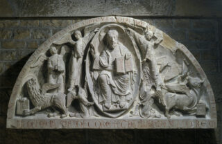 Si son emplacement original au sein de l’abbaye Saint-Bénigne pose toujours question, il est vraisemblable qu’il puisse provenir d’une porte située entre l’église et le cloître. La composition du tympan du Christ en majesté ne présente guère d’analogies avec le tympan de Cène : le dynamisme des figures angéliques longues et mobiles, sommées de petites têtes, contraste en effet avec la stabilité des figures robustes de celui de la Cène.