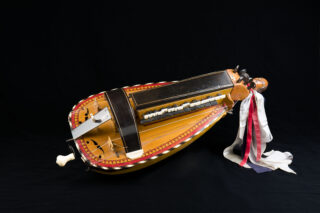 Cette vielle à roue de forme luth a été fabriquée à Jeanzat (Allier) dans l’atelier de Pimpard Cousin. Ornée au manche d’une tête d’homme, elle est similaire à d’autres productions de cet atelier. Jeanzat est un centre luthier important, d’où proviennent de nombreuses vielles à roue. Cet instrument au son particulier de bourdonnement est un incontournable des fêtes villageoises dans la Bourgogne du 19e siècle. Pour en jouer, le musicien tourne la manivelle, actionnant ainsi la roue sur laquelle vibrent les cordes, tout en jouant, de l’autre main, sur les touches.