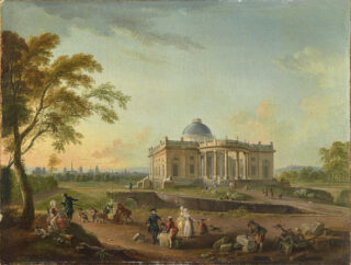 Peintre de scènes de genre et de paysages de fantaisie avec des ruines romaines, le Dijonnais Jean-Baptiste Lallemand a également laissé quelques paysages bourguignons, qui constituent aujourd’hui de précieux témoignages historiques et topographiques. C’est le cas de cette vue du château de Montmusard, résidence du Premier président du Parlement de Bourgogne, Jean-Philippe Fyot de La Marche, qui commanda à l’artiste la vue de son château vers 1770 pour remercier son homme de confiance, l’abbé Fabarel, maître d’œuvre de cette originale résidence. Édifiée près de Dijon autour de 1765, d’après les plans du jeune architecte parisien Charles de Wailly, cette « folie » est l’une des premières manifestations architecturales néoclassiques de province.